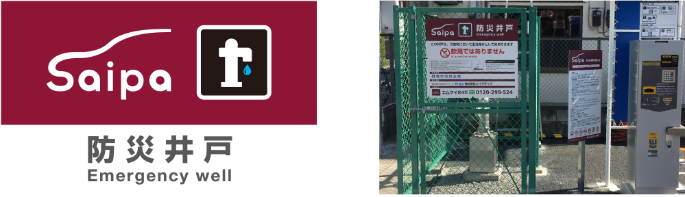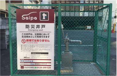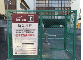 サイパの防災井戸は現在川口市において青木信用金庫、川口市と防災協定を結び、駐車場内に設置された防災井戸を災害時に近隣住民の方々に自由にご利用いただくようになっております。飲用以外での活躍が期待されております。