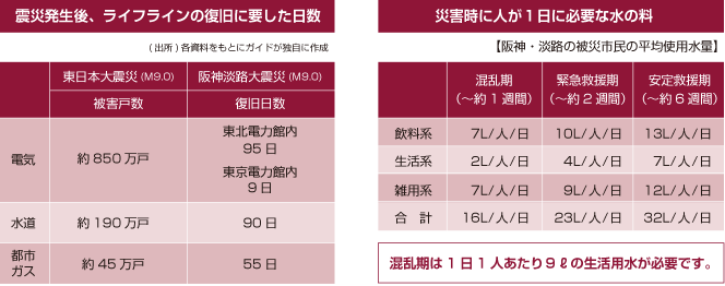 昨今、防災対策として建物の耐震化、防災備品の整備等の取り組みが進んでおり、被害を最小限にする努力が行われておりますが生活用水においては必要量が膨大なため、備蓄できない状況となっております。